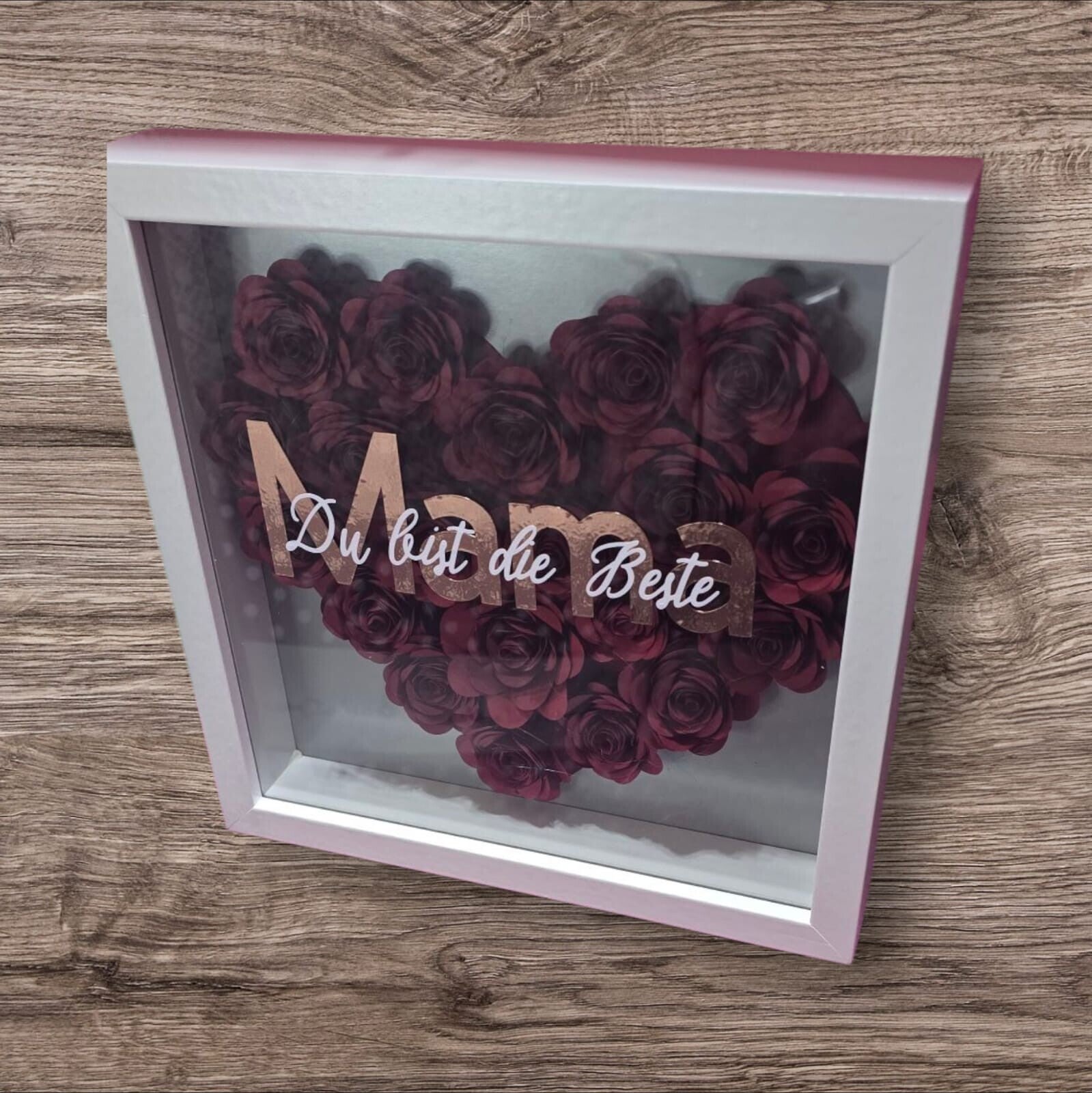 ein stilvoller Bilderrahmen, liebevoll gefüllt mit selbstgedrehten Papierrosen und deiner persönlichen Botschaft.