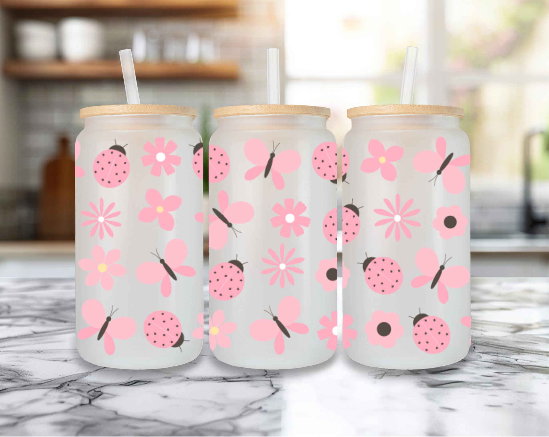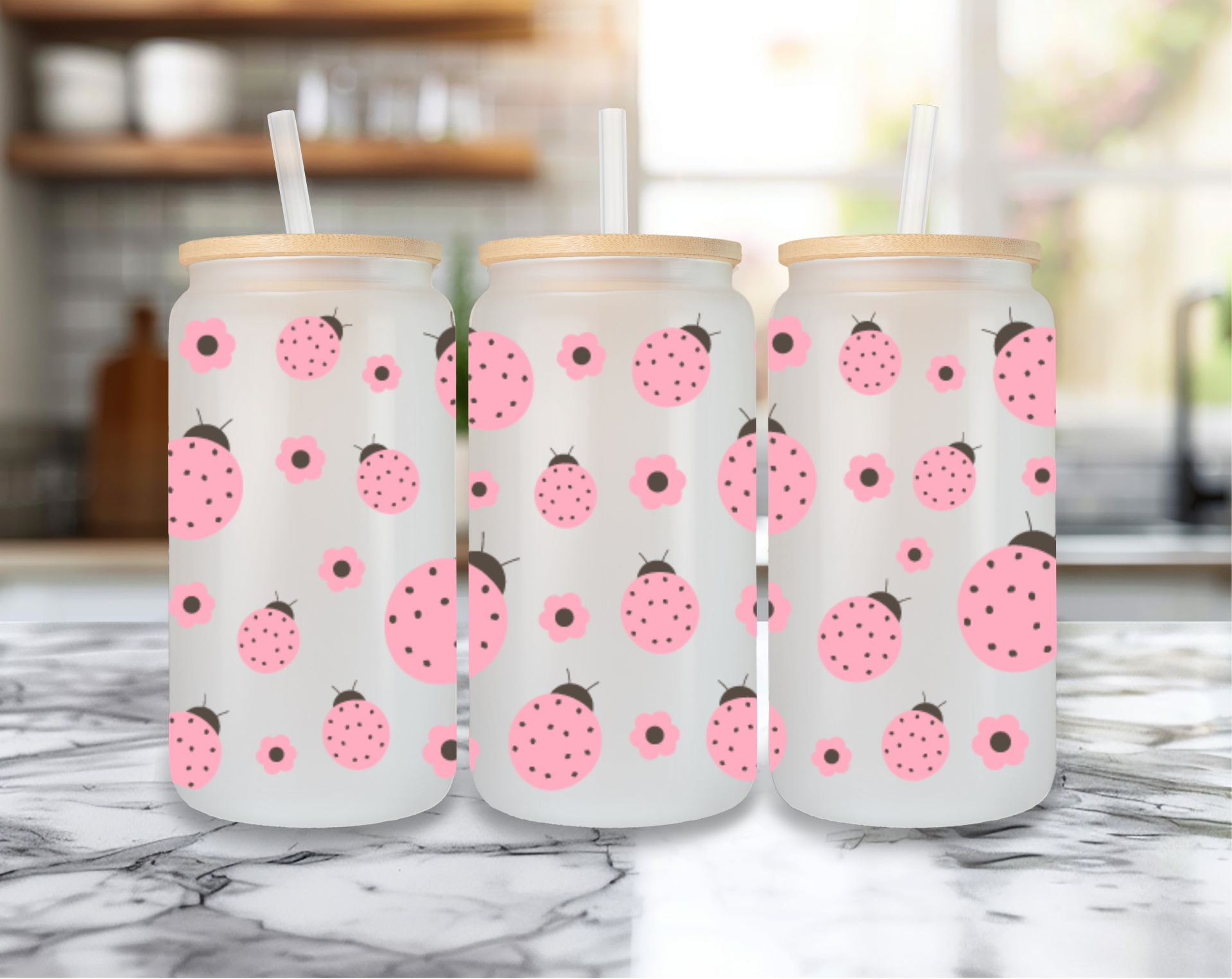 🌸 Trinkglas mit Marienkäfer-Motiv – 520 ml mit Bambusdeckel & Strohhalm